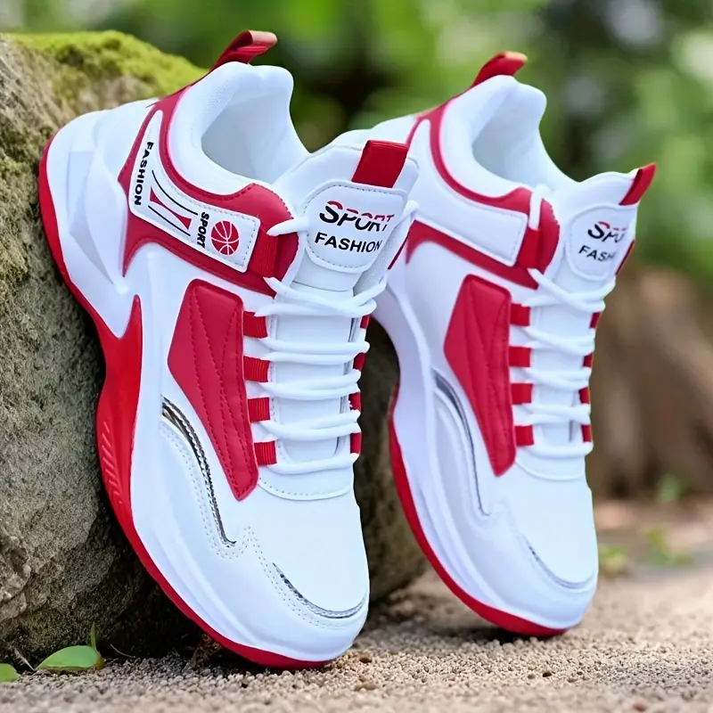 Chaussures de sport montantes pour hommes 2025 - Blanc et rouge, décontractées, avec fermeture à lacets, chaussures de course en plein air toutes saisons, chaussures de formation décontractées, chaussures de course décontractées | Chaussures de sport montantes | Design à lacets